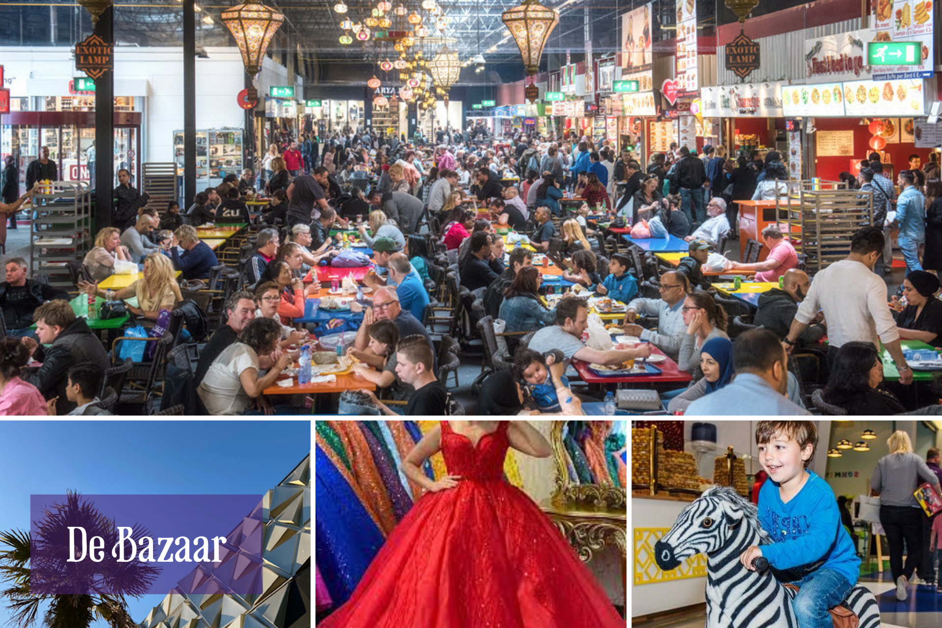 Bezoekers kunnen hun winkelreis beginnen in de Oosterse Markt, een van de grootste secties van De Bazaar. Hier kunnen shoppers een uitgebreid aanbod aan exotische producten vinden, waaronder kruiden en specerijen, mode, woonaccessoires en huishoudelijke artikelen. De andere secties van De Bazaar zijn onder andere de Nostalgische Markt, de Grand Bazaar, de Goudsouk en het Foodcourt met De Bazaar wereldkeuken.